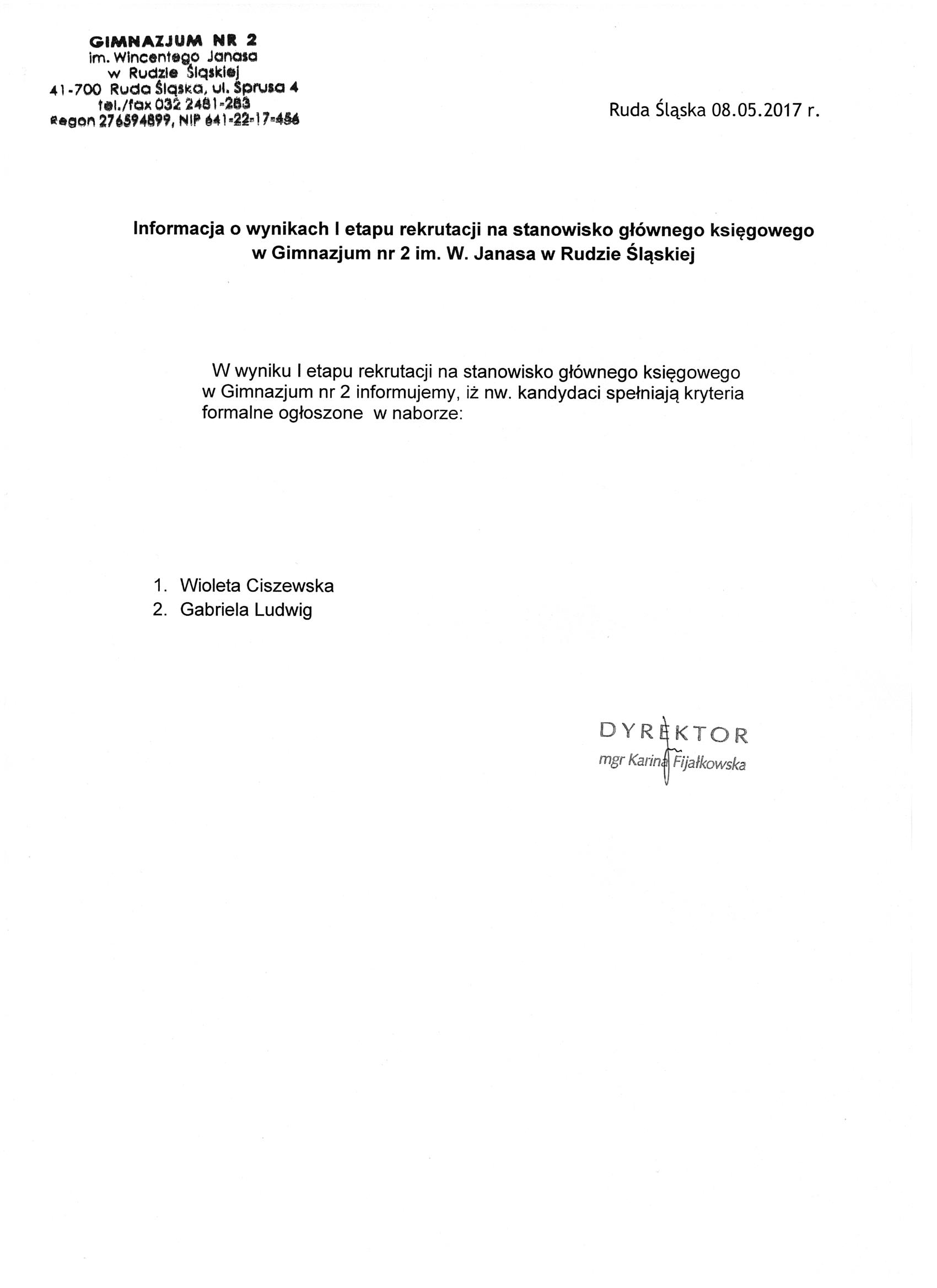 Informację o wynikach pierwszego etapu naboru Utworzono: 14 maj 2017 | Poprawiono: 14 maj 2017 | Opublikowano: 14 maj 2017 | Karina Fijałkowska | Drukuj | E-mail | Odsłony: 2711 Dyrektor Gimnazjum nr 2 im. Wincentego Janasa w Rudzie Śląskiej ogłasza informację o wynikach pierwszego etapu naboru na stanowisko pracy: Główny Księgowy (...) Załączniki: informacja.jpg[ ]151 kB2017-05-14 21:16 Poprzedni artykuł Następny artykuł
