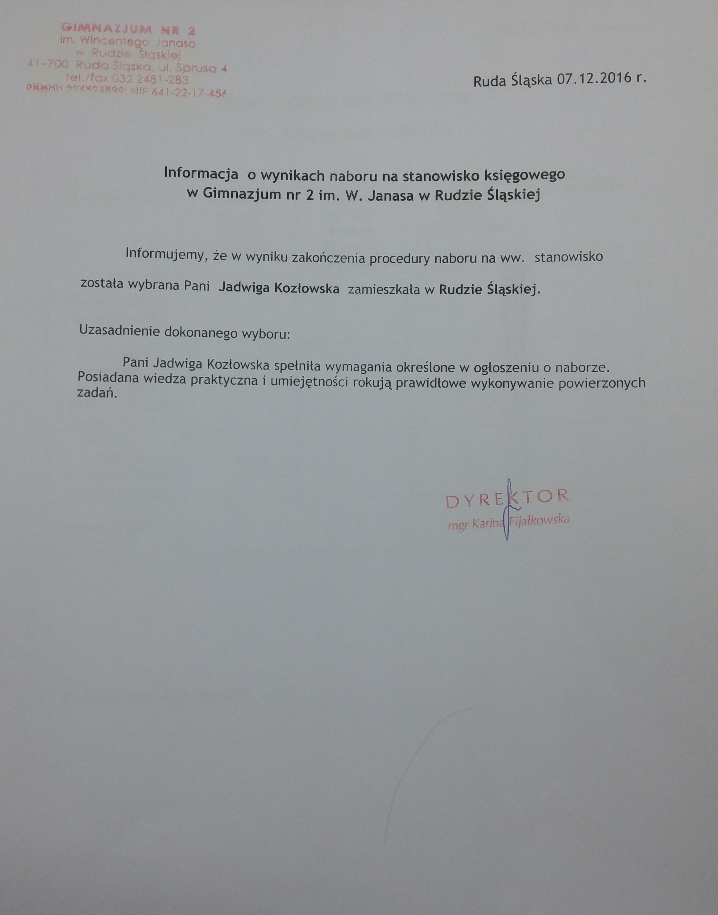 Dyrektor Gimnazjum nr 2 im. Wincentego Janasa